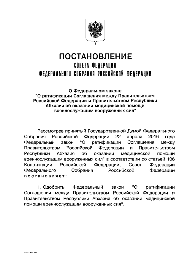 "О ФЕДЕРАЛЬНОМ ЗАКОНЕ "О РАТИФИКАЦИИ СОГЛАШЕНИЯ МЕЖДУ ПРАВИТЕЛЬСТВОМ РОССИЙСКОЙ ФЕДЕРАЦИИ И ПРАВИТЕЛЬСТВОМ РЕСПУБЛИКИ АБХАЗИЯ ОБ ОКАЗАНИИ МЕДИЦИНСКОЙ ПОМОЩИ ВОЕННОСЛУЖАЩИМ ВООРУЖЕННЫХ СИЛ"
