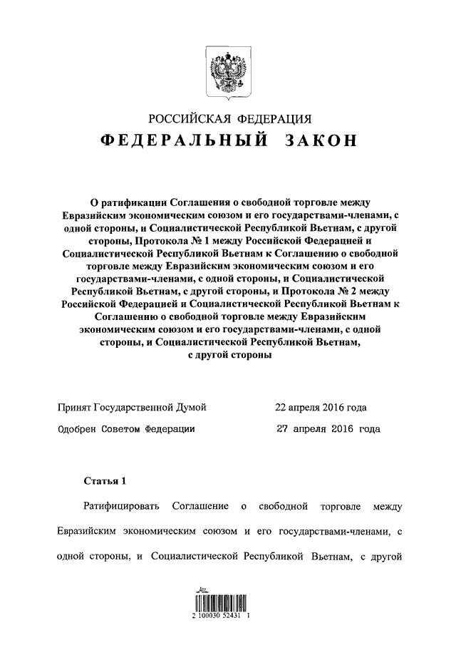 "О РАТИФИКАЦИИ СОГЛАШЕНИЯ О СВОБОДНОЙ ТОРГОВЛЕ МЕЖДУ ЕВРАЗИЙСКИМ