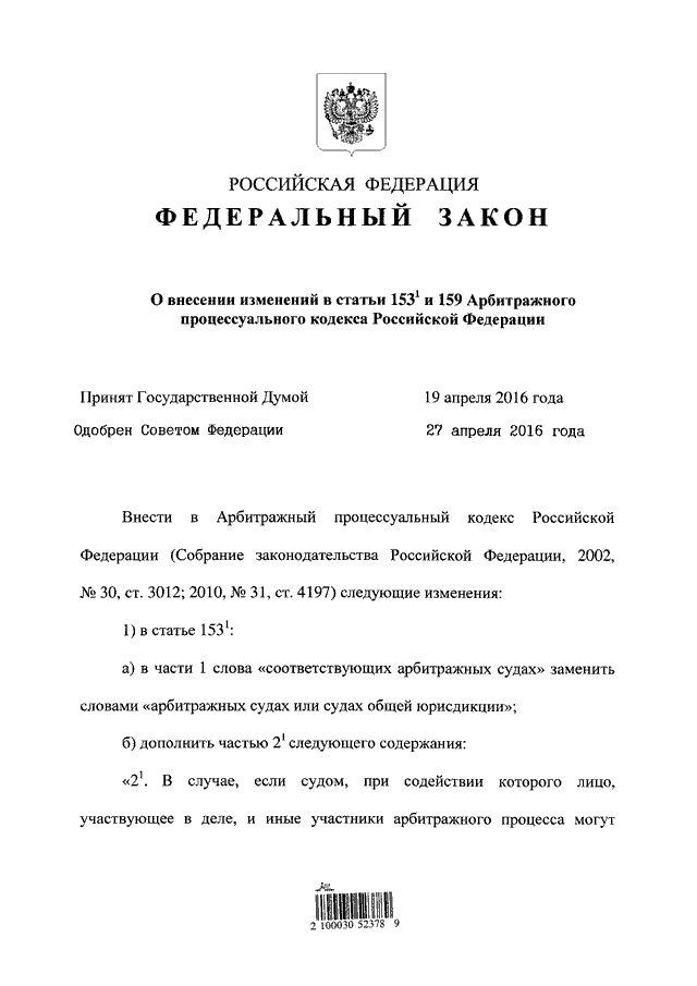 "О ВНЕСЕНИИ ИЗМЕНЕНИЙ В СТАТЬИ 153.1 И 159 АРБИТРАЖНОГО ПРОЦЕССУАЛЬНОГО КОДЕКСА РОССИЙСКОЙ ФЕДЕРАЦИИ"