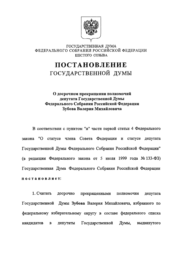 "О ДОСРОЧНОМ ПРЕКРАЩЕНИИ ПОЛНОМОЧИЙ ДЕПУТАТА ГОСУДАРСТВЕННОЙ ДУМЫ ФЕДЕРАЛЬНОГО СОБРАНИЯ РОССИЙСКОЙ ФЕДЕРАЦИИ ЗУБОВА ВАЛЕРИЯ МИХАЙЛОВИЧА"