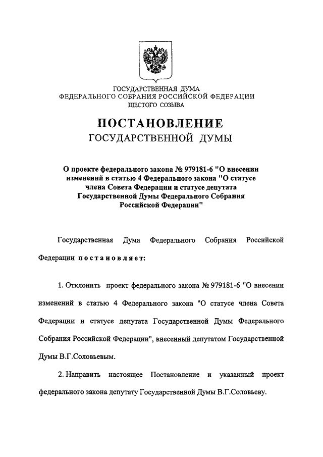 "О ПРОЕКТЕ ФЕДЕРАЛЬНОГО ЗАКОНА N 979181-6 "О ВНЕСЕНИИ ИЗМЕНЕНИЙ