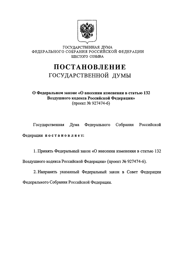 "О ФЕДЕРАЛЬНОМ ЗАКОНЕ "О ВНЕСЕНИИ ИЗМЕНЕНИЯ В СТАТЬЮ 132 ВОЗДУШНОГО КОДЕКСА РОССИЙСКОЙ ФЕДЕРАЦИИ" (ПРОЕКТ N 927474-6)"
