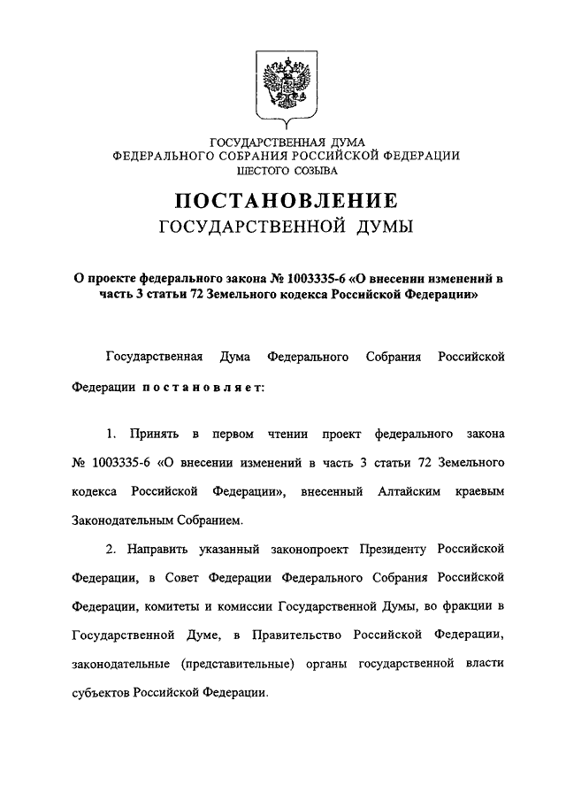 "О ПРОЕКТЕ ФЕДЕРАЛЬНОГО ЗАКОНА N 1003335-6 "О ВНЕСЕНИИ ИЗМЕНЕНИЙ В ЧАСТЬ 3 СТАТЬИ 72 ЗЕМЕЛЬНОГО КОДЕКСА РОССИЙСКОЙ ФЕДЕРАЦИИ"
