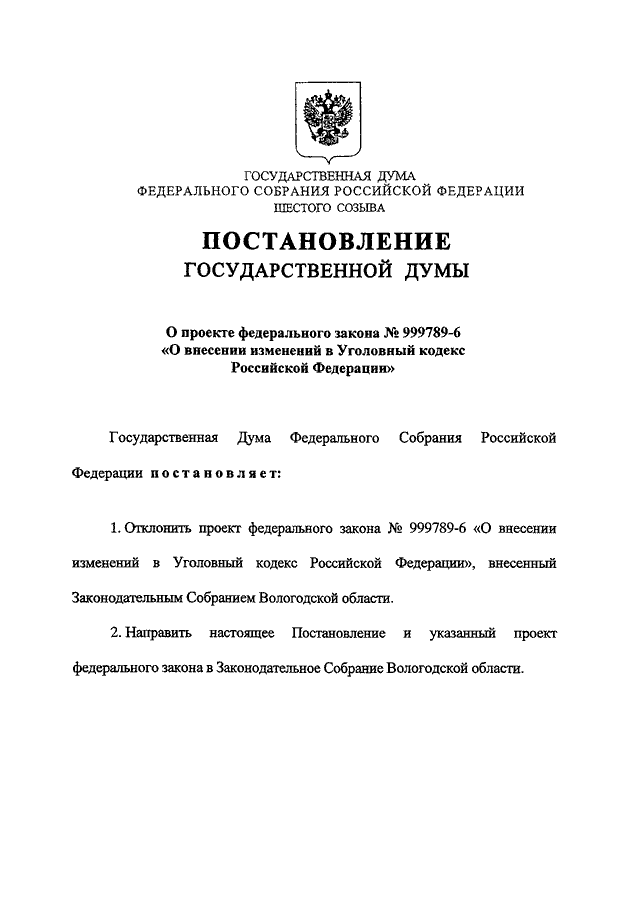 "О ПРОЕКТЕ ФЕДЕРАЛЬНОГО ЗАКОНА N 999789-6 "О ВНЕСЕНИИ ИЗМЕНЕНИЙ В УГОЛОВНЫЙ КОДЕКС РОССИЙСКОЙ ФЕДЕРАЦИИ"