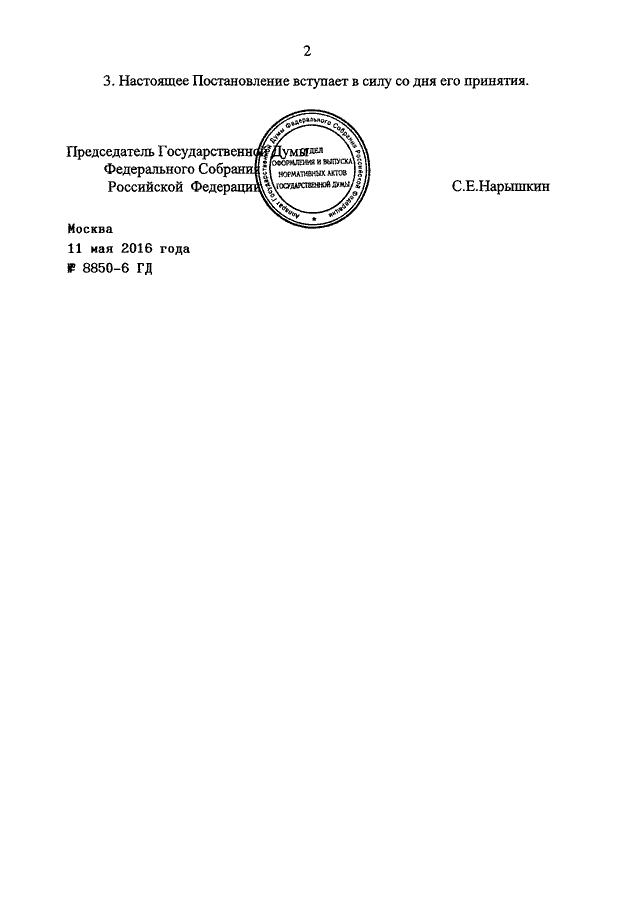 ПОСТАНОВЛЕНИЕ ГД ФС РФ от 11.05.2016 N 8850-6 ГД