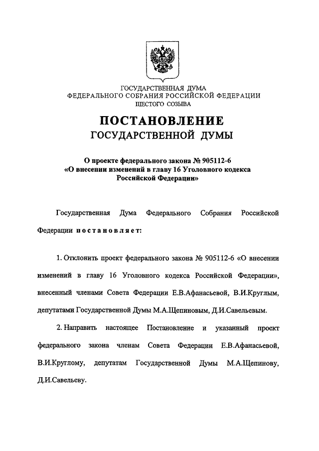 "О ПРОЕКТЕ ФЕДЕРАЛЬНОГО ЗАКОНА N 905112-6 "О ВНЕСЕНИИ ИЗМЕНЕНИЙ В ГЛАВУ 16 УГОЛОВНОГО КОДЕКСА РОССИЙСКОЙ ФЕДЕРАЦИИ"