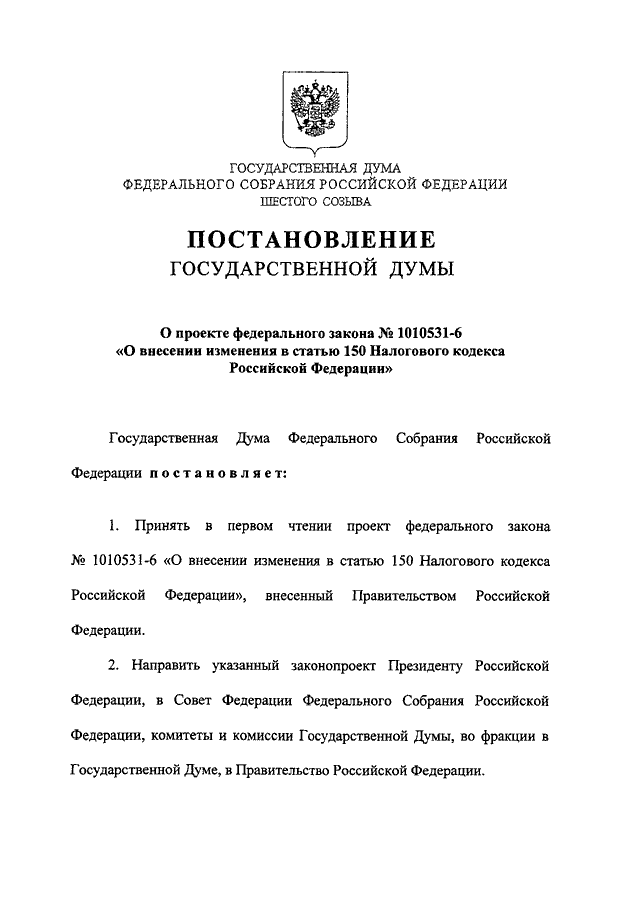 "О ПРОЕКТЕ ФЕДЕРАЛЬНОГО ЗАКОНА N 1010531-6 "О ВНЕСЕНИИ ИЗМЕНЕНИЯ В СТАТЬЮ 150 НАЛОГОВОГО КОДЕКСА РОССИЙСКОЙ ФЕДЕРАЦИИ"