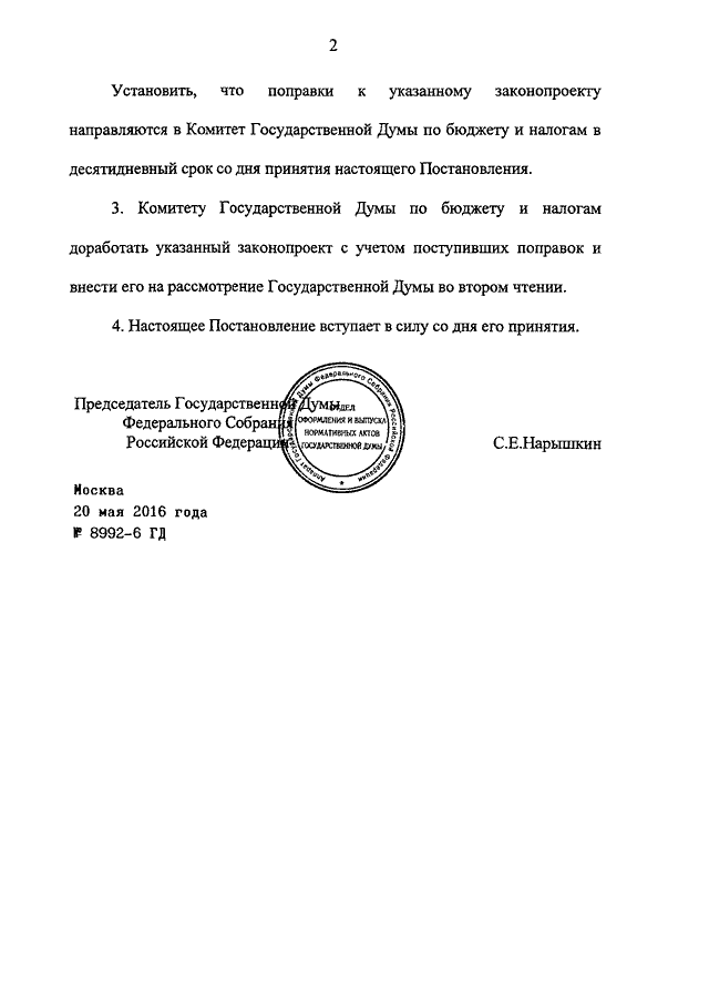 ПОСТАНОВЛЕНИЕ ГД ФС РФ от 20.05.2016 N 8992-6 ГД