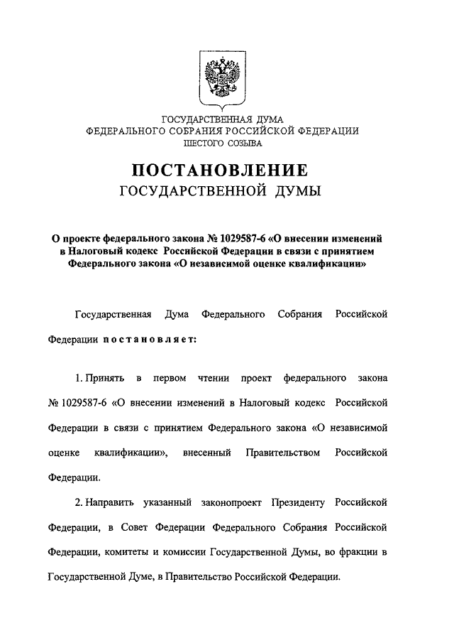 "О ПРОЕКТЕ ФЕДЕРАЛЬНОГО ЗАКОНА N 1029587-6 "О ВНЕСЕНИИ ИЗМЕНЕНИЙ В НАЛОГОВЫЙ КОДЕКС РОССИЙСКОЙ ФЕДЕРАЦИИ В СВЯЗИ С ПРИНЯТИЕМ ФЕДЕРАЛЬНОГО ЗАКОНА "О НЕЗАВИСИМОЙ ОЦЕНКЕ КВАЛИФИКАЦИИ"