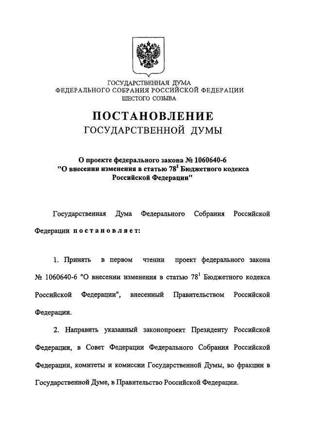 "О ПРОЕКТЕ ФЕДЕРАЛЬНОГО ЗАКОНА N 1060640-6 "О ВНЕСЕНИИ ИЗМЕНЕНИЯ В СТАТЬЮ 78.1 БЮДЖЕТНОГО КОДЕКСА РОССИЙСКОЙ ФЕДЕРАЦИИ"