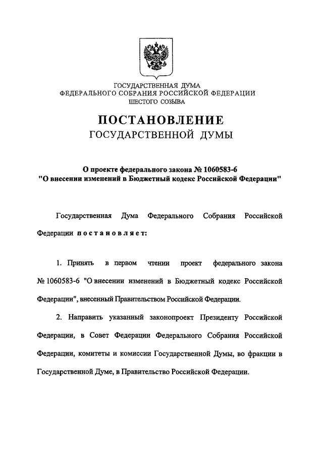 "О ПРОЕКТЕ ФЕДЕРАЛЬНОГО ЗАКОНА N 1060583-6 "О ВНЕСЕНИИ ИЗМЕНЕНИЙ В БЮДЖЕТНЫЙ КОДЕКС РОССИЙСКОЙ ФЕДЕРАЦИИ"