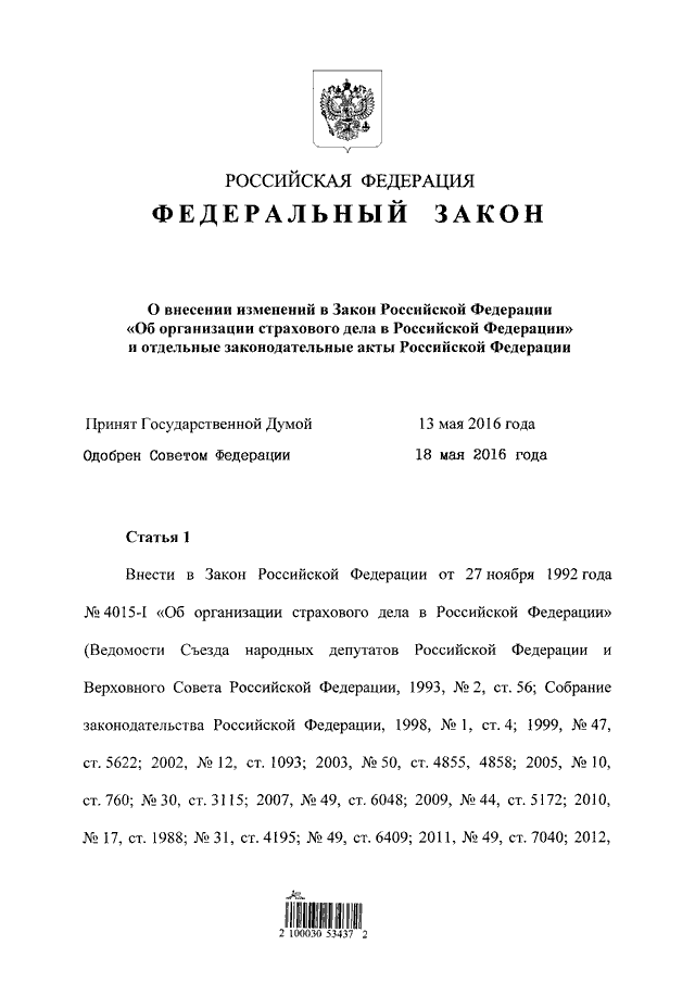 "О ВНЕСЕНИИ ИЗМЕНЕНИЙ В ЗАКОН РОССИЙСКОЙ ФЕДЕРАЦИИ "ОБ ОРГАНИЗАЦИИ СТРАХОВОГО ДЕЛА В РОССИЙСКОЙ ФЕДЕРАЦИИ" И ОТДЕЛЬНЫЕ ЗАКОНОДАТЕЛЬНЫЕ АКТЫ РОССИЙСКОЙ ФЕДЕРАЦИИ"