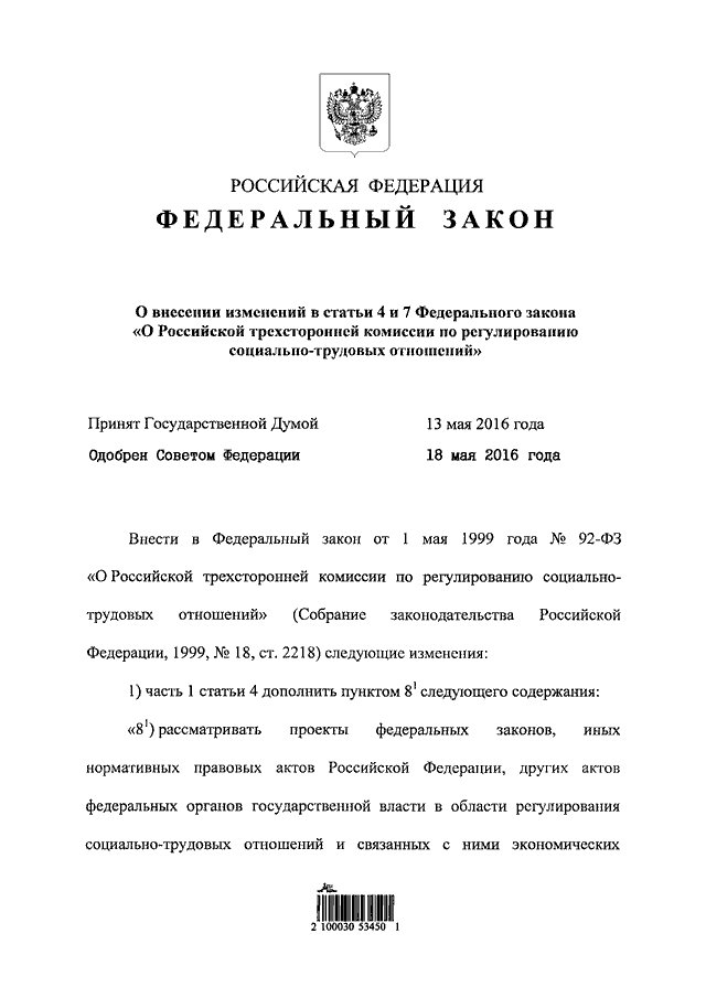 "О ВНЕСЕНИИ ИЗМЕНЕНИЙ В СТАТЬИ 4 И 7 ФЕДЕРАЛЬНОГО ЗАКОНА "О РОССИЙСКОЙ ТРЕХСТОРОННЕЙ КОМИССИИ ПО РЕГУЛИРОВАНИЮ СОЦИАЛЬНО - ТРУДОВЫХ ОТНОШЕНИЙ"