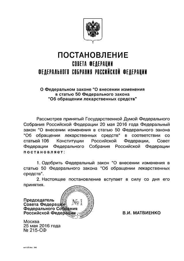 ПОСТАНОВЛЕНИЕ СФ ФС РФ от 25.05.2016 N 215-СФ