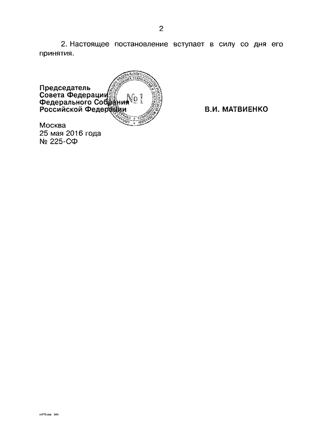 ПОСТАНОВЛЕНИЕ СФ ФС РФ от 25.05.2016 N 225-СФ