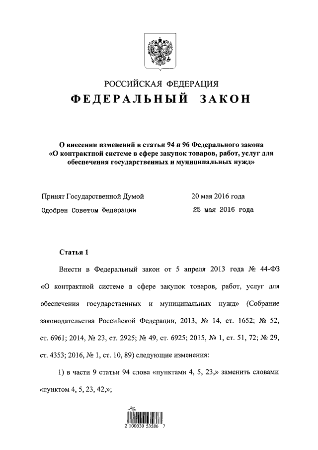 "О ВНЕСЕНИИ ИЗМЕНЕНИЙ В СТАТЬИ 94 И 96 ФЕДЕРАЛЬНОГО ЗАКОНА "О КОНТРАКТНОЙ СИСТЕМЕ В СФЕРЕ ЗАКУПОК ТОВАРОВ, РАБОТ, УСЛУГ ДЛЯ ОБЕСПЕЧЕНИЯ ГОСУДАРСТВЕННЫХ И МУНИЦИПАЛЬНЫХ НУЖД"