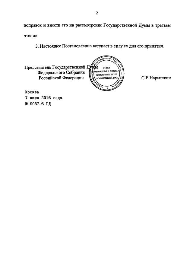 ПОСТАНОВЛЕНИЕ ГД ФС РФ от 07.06.2016 N 9057-6 ГД