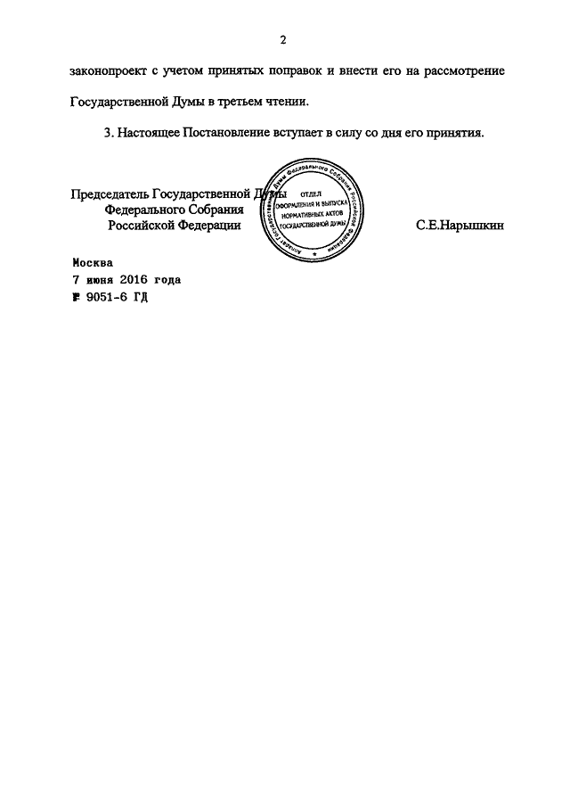 ПОСТАНОВЛЕНИЕ ГД ФС РФ от 07.06.2016 N 9051-6 ГД