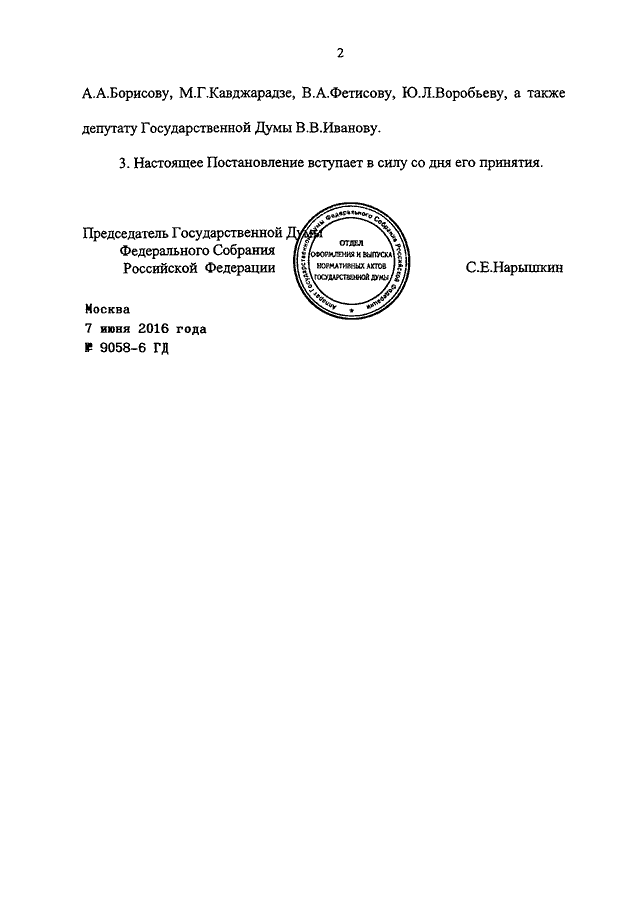 ПОСТАНОВЛЕНИЕ ГД ФС РФ от 07.06.2016 N 9058-6 ГД