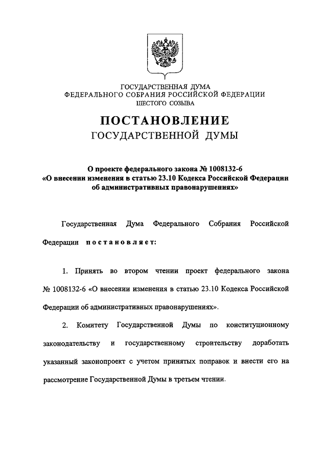 "О ПРОЕКТЕ ФЕДЕРАЛЬНОГО ЗАКОНА N 1008132-6 "О ВНЕСЕНИИ ИЗМЕНЕНИЯ В СТАТЬЮ 23.10 КОДЕКСА РОССИЙСКОЙ ФЕДЕРАЦИИ ОБ АДМИНИСТРАТИВНЫХ ПРАВОНАРУШЕНИЯХ"