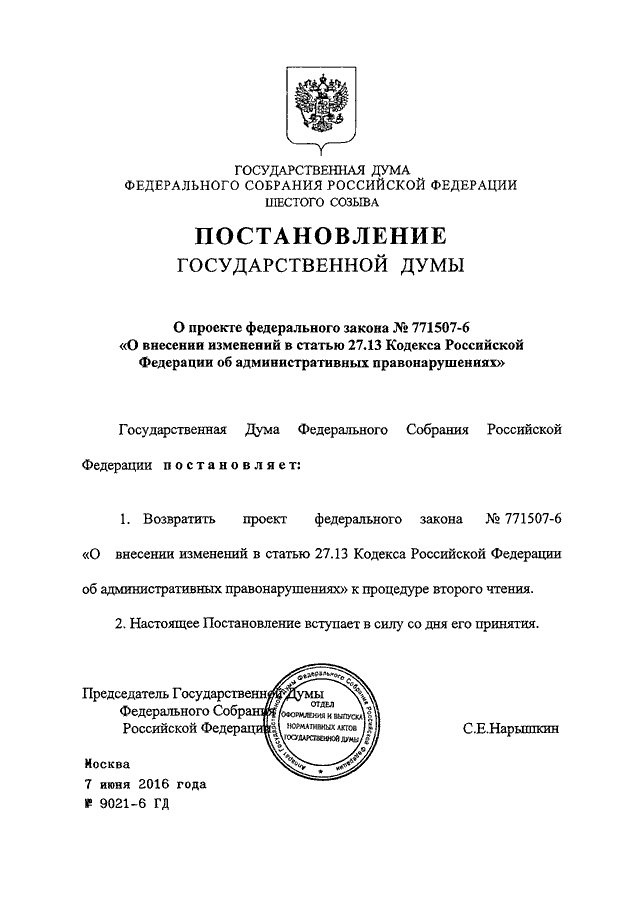 "О ПРОЕКТЕ ФЕДЕРАЛЬНОГО ЗАКОНА N 771507-6 "О ВНЕСЕНИИ ИЗМЕНЕНИЙ В СТАТЬЮ 27.13 КОДЕКСА РОССИЙСКОЙ ФЕДЕРАЦИИ ОБ АДМИНИСТРАТИВНЫХ ПРАВОНАРУШЕНИЯХ"