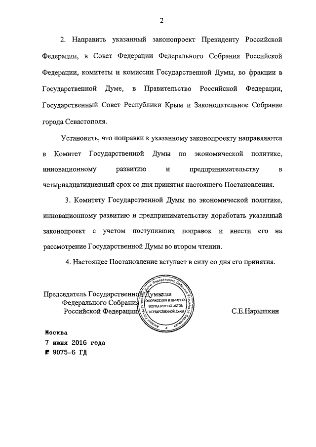 ПОСТАНОВЛЕНИЕ ГД ФС РФ от 07.06.2016 N 9075-6 ГД