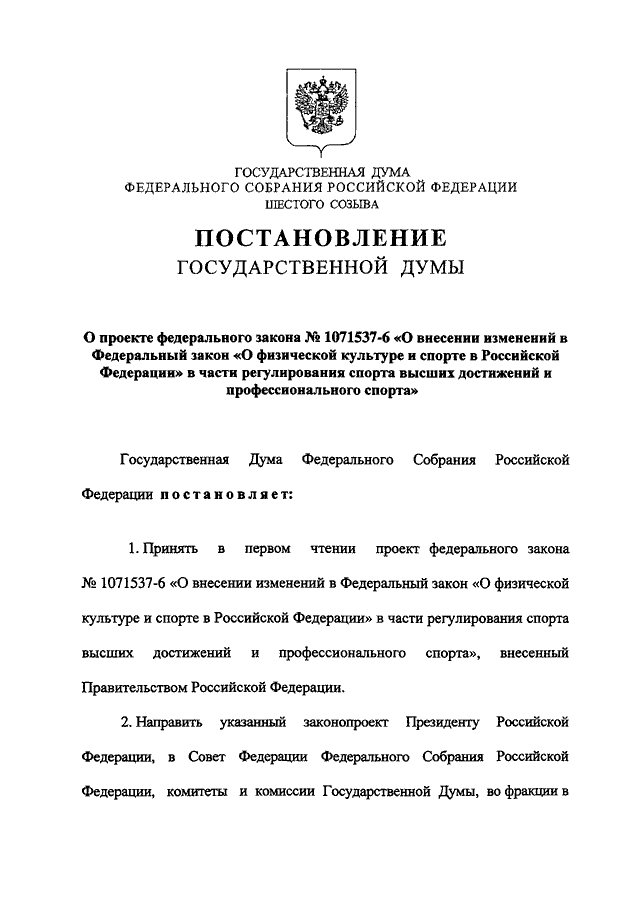 "О ПРОЕКТЕ ФЕДЕРАЛЬНОГО ЗАКОНА N 1071537-6 "О ВНЕСЕНИИ ИЗМЕНЕНИЙ В