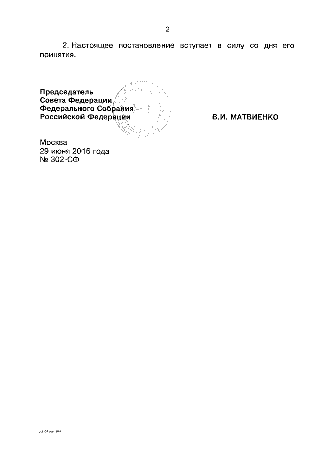 ПОСТАНОВЛЕНИЕ СФ ФС РФ от 29.06.2016 N 302-СФ