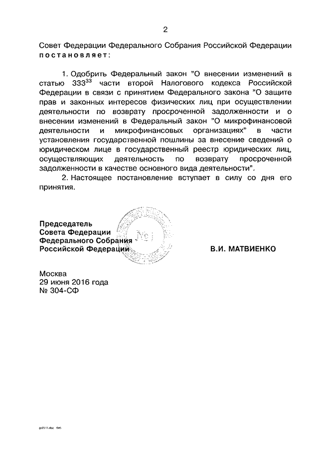 ПОСТАНОВЛЕНИЕ СФ ФС РФ от 29.06.2016 N 304-СФ