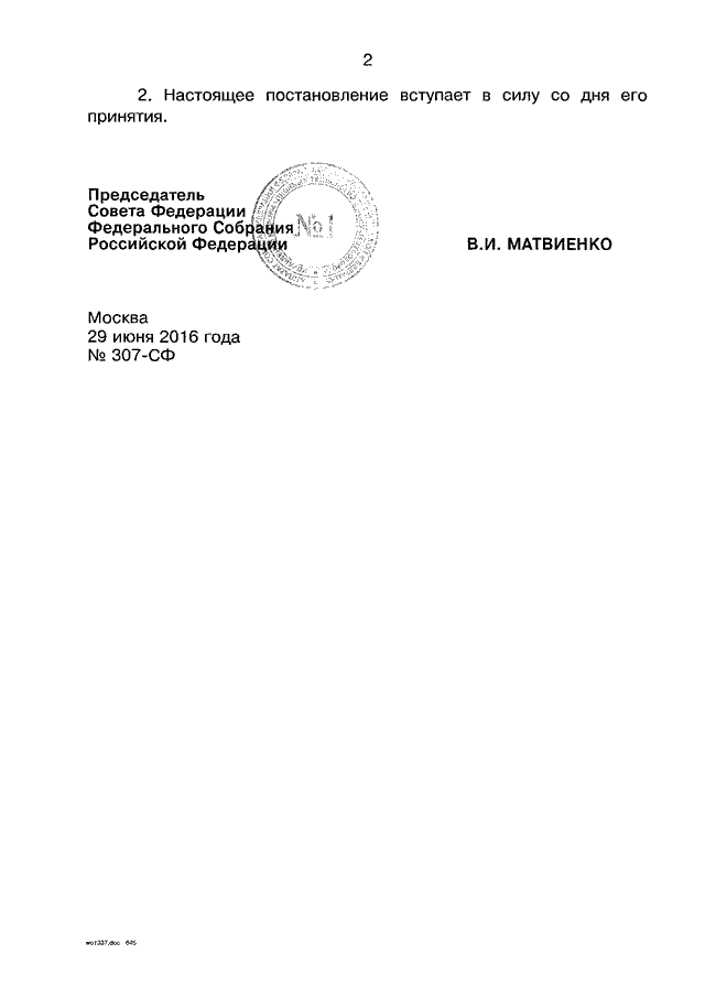 ПОСТАНОВЛЕНИЕ СФ ФС РФ от 29.06.2016 N 307-СФ