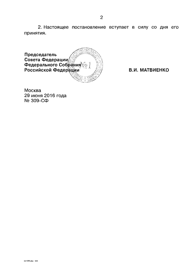 ПОСТАНОВЛЕНИЕ СФ ФС РФ от 29.06.2016 N 309-СФ