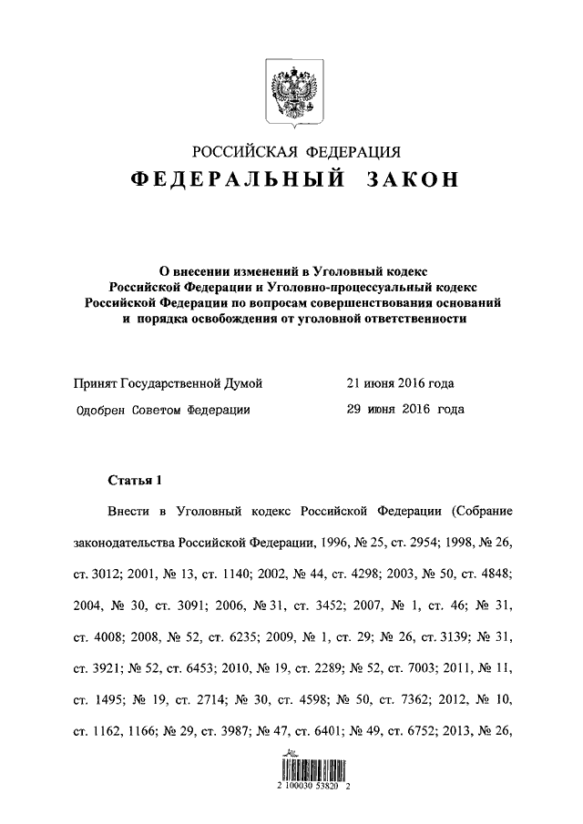 "О ВНЕСЕНИИ ИЗМЕНЕНИЙ В УГОЛОВНЫЙ КОДЕКС РОССИЙСКОЙ ФЕДЕРАЦИИ И УГОЛОВНО - ПРОЦЕССУАЛЬНЫЙ КОДЕКС РОССИЙСКОЙ ФЕДЕРАЦИИ ПО ВОПРОСАМ СОВЕРШЕНСТВОВАНИЯ ОСНОВАНИЙ И ПОРЯДКА ОСВОБОЖДЕНИЯ ОТ УГОЛОВНОЙ ОТВЕТСТВЕННОСТИ"