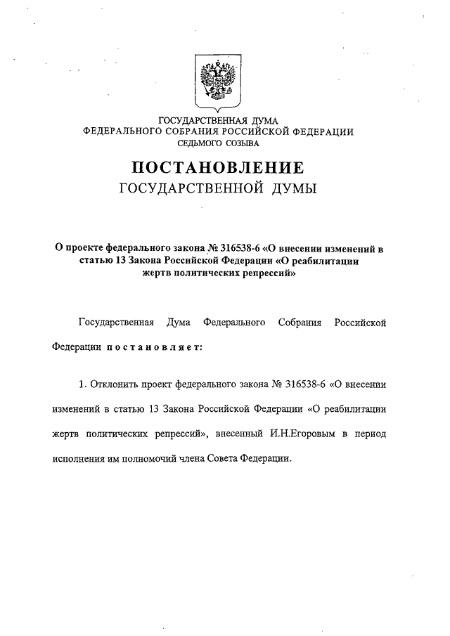 "О ПРОЕКТЕ ФЕДЕРАЛЬНОГО ЗАКОНА N 316538-6 "О ВНЕСЕНИИ ИЗМЕНЕНИЙ В СТАТЬЮ 13 ЗАКОНА РОССИЙСКОЙ ФЕДЕРАЦИИ "О РЕАБИЛИТАЦИИ ЖЕРТВ ПОЛИТИЧЕСКИХ РЕПРЕССИЙ"