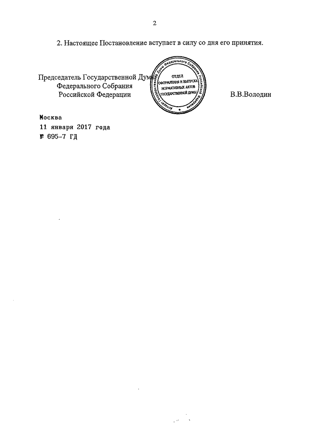 ПОСТАНОВЛЕНИЕ ГД ФС РФ от 11.01.2017 N 695-7 ГД