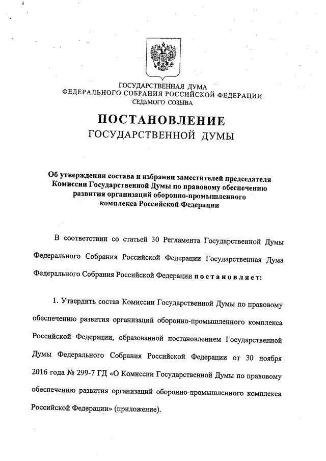 "ОБ УТВЕРЖДЕНИИ СОСТАВА И ИЗБРАНИИ ЗАМЕСТИТЕЛЕЙ ПРЕДСЕДАТЕЛЯ КОМИССИИ ГОСУДАРСТВЕННОЙ ДУМЫ ПО ПРАВОВОМУ ОБЕСПЕЧЕНИЮ РАЗВИТИЯ ОРГАНИЗАЦИЙ ОБОРОННО - ПРОМЫШЛЕННОГО КОМПЛЕКСА РОССИЙСКОЙ ФЕДЕРАЦИИ"