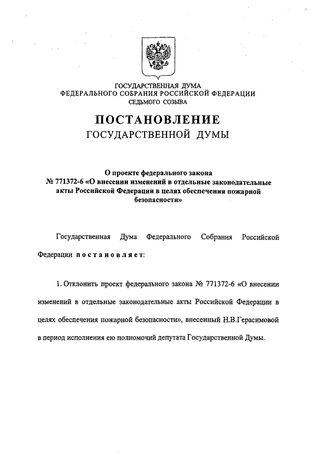 "О ПРОЕКТЕ ФЕДЕРАЛЬНОГО ЗАКОНА N 771372-6 "О ВНЕСЕНИИ ИЗМЕНЕНИЙ В ОТДЕЛЬНЫЕ ЗАКОНОДАТЕЛЬНЫЕ АКТЫ РОССИЙСКОЙ ФЕДЕРАЦИИ В ЦЕЛЯХ ОБЕСПЕЧЕНИЯ ПОЖАРНОЙ БЕЗОПАСНОСТИ"