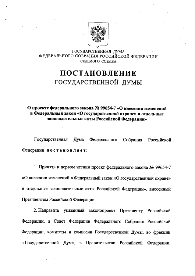 "О ПРОЕКТЕ ФЕДЕРАЛЬНОГО ЗАКОНА N 99654-7 "О ВНЕСЕНИИ ИЗМЕНЕНИЙ В ФЕДЕРАЛЬНЫЙ ЗАКОН "О ГОСУДАРСТВЕННОЙ ОХРАНЕ" И ОТДЕЛЬНЫЕ ЗАКОНОДАТЕЛЬНЫЕ АКТЫ РОССИЙСКОЙ ФЕДЕРАЦИИ"