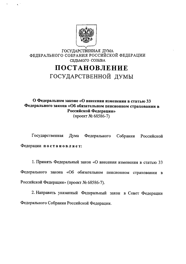 "О ФЕДЕРАЛЬНОМ ЗАКОНЕ "О ВНЕСЕНИИ ИЗМЕНЕНИЯ В СТАТЬЮ 33 ФЕДЕРАЛЬНОГО ЗАКОНА "ОБ ОБЯЗАТЕЛЬНОМ ПЕНСИОННОМ СТРАХОВАНИИ В РОССИЙСКОЙ ФЕДЕРАЦИИ" (ПРОЕКТ N 68586-7)"