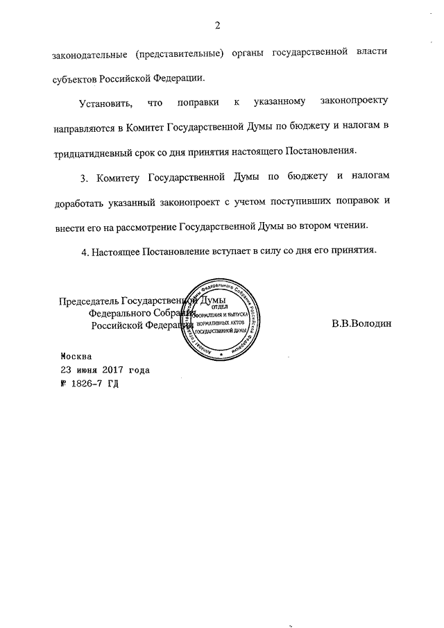 ПОСТАНОВЛЕНИЕ ГД ФС РФ от 23.06.2017 N 1826-7 ГД
