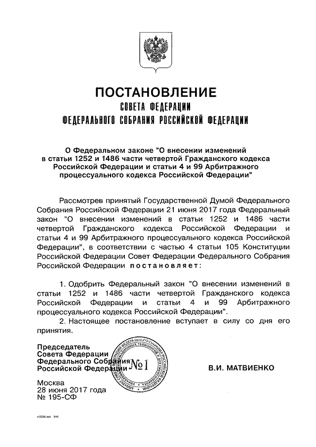 "О ФЕДЕРАЛЬНОМ ЗАКОНЕ "О ВНЕСЕНИИ ИЗМЕНЕНИЙ В СТАТЬИ 1252 И 1486 ЧАСТИ ЧЕТВЕРТОЙ ГРАЖДАНСКОГО КОДЕКСА РОССИЙСКОЙ ФЕДЕРАЦИИ И СТАТЬИ 4 И 99 АРБИТРАЖНОГО ПРОЦЕССУАЛЬНОГО КОДЕКСА РОССИЙСКОЙ ФЕДЕРАЦИИ"