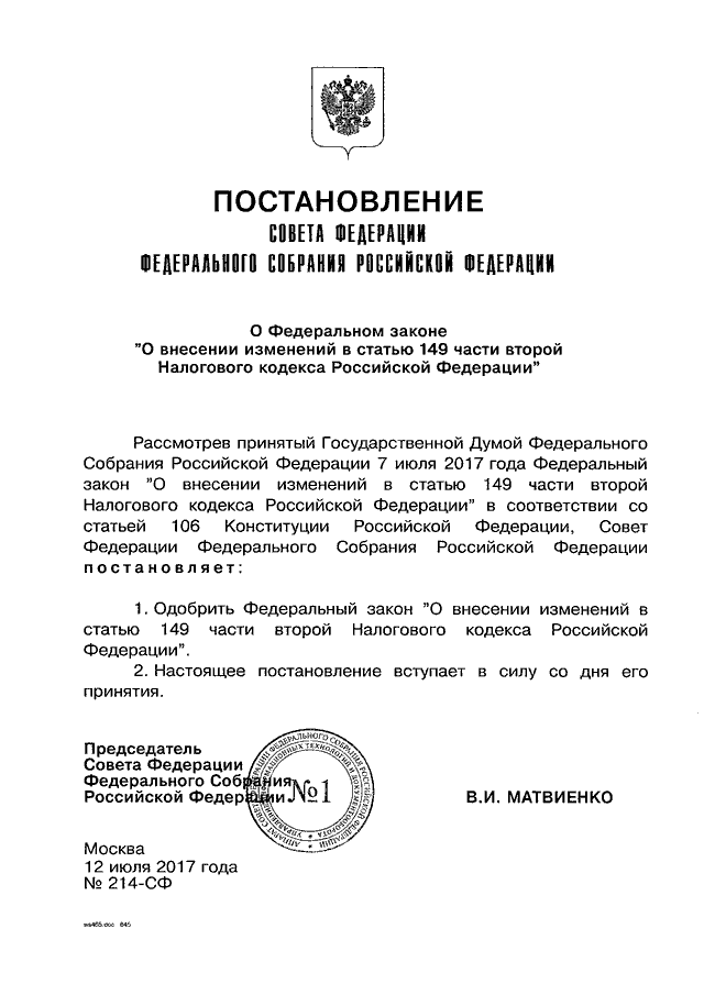 ПОСТАНОВЛЕНИЕ СФ ФС РФ от 12.07.2017 N 214-СФ