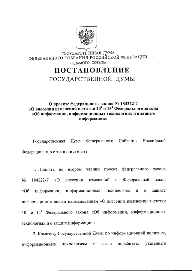 "О ПРОЕКТЕ ФЕДЕРАЛЬНОГО ЗАКОНА N 184222-7 "О ВНЕСЕНИИ ИЗМЕНЕНИЙ В СТАТЬИ 10.1 И 15.4 ФЕДЕРАЛЬНОГО ЗАКОНА "ОБ ИНФОРМАЦИИ, ИНФОРМАЦИОННЫХ ТЕХНОЛОГИЯХ И О ЗАЩИТЕ ИНФОРМАЦИИ"