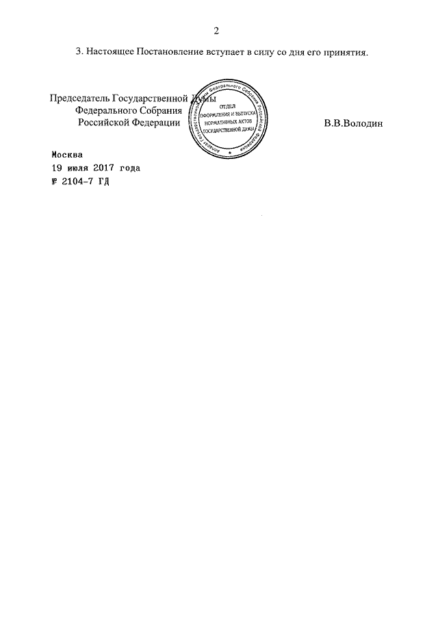 ПОСТАНОВЛЕНИЕ ГД ФС РФ от 19.07.2017 N 2104-7 ГД