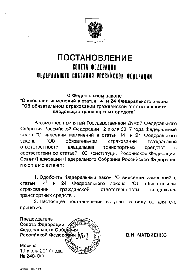 ПОСТАНОВЛЕНИЕ СФ ФС РФ от 19.07.2017 N 248-СФ