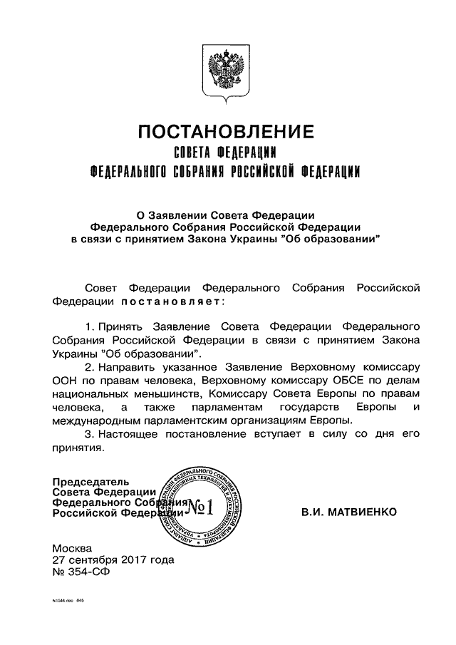 "О ЗАЯВЛЕНИИ СОВЕТА ФЕДЕРАЦИИ ФЕДЕРАЛЬНОГО СОБРАНИЯ РОССИЙСКОЙ ФЕДЕРАЦИИ В СВЯЗИ С ПРИНЯТИЕМ ЗАКОНА УКРАИНЫ "ОБ ОБРАЗОВАНИИ"