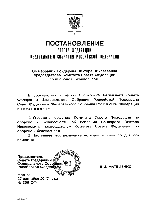 "ОБ ИЗБРАНИИ БОНДАРЕВА ВИКТОРА НИКОЛАЕВИЧА ПРЕДСЕДАТЕЛЕМ КОМИТЕТА СОВЕТА ФЕДЕРАЦИИ ПО ОБОРОНЕ И БЕЗОПАСНОСТИ"