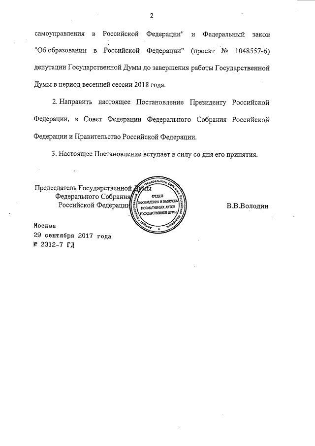 ПОСТАНОВЛЕНИЕ ГД ФС РФ от 29.09.2017 N 2312-7 ГД