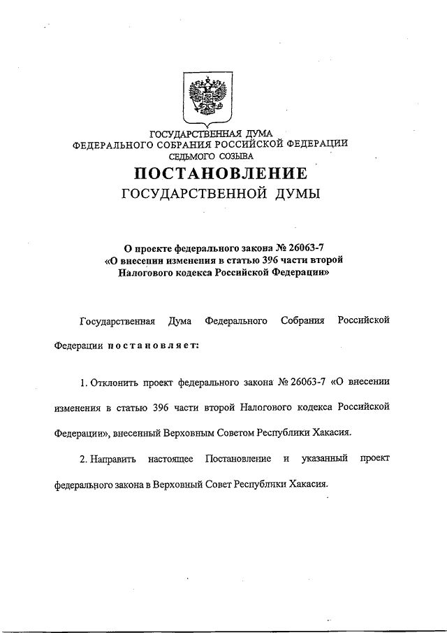 "О ПРОЕКТЕ ФЕДЕРАЛЬНОГО ЗАКОНА N 26063-7 "О ВНЕСЕНИИ ИЗМЕНЕНИЯ В СТАТЬЮ 396 ЧАСТИ ВТОРОЙ НАЛОГОВОГО КОДЕКСА РОССИЙСКОЙ ФЕДЕРАЦИИ"