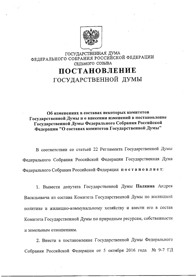 "ОБ ИЗМЕНЕНИЯХ В СОСТАВАХ НЕКОТОРЫХ КОМИТЕТОВ ГОСУДАРСТВЕННОЙ ДУМЫ