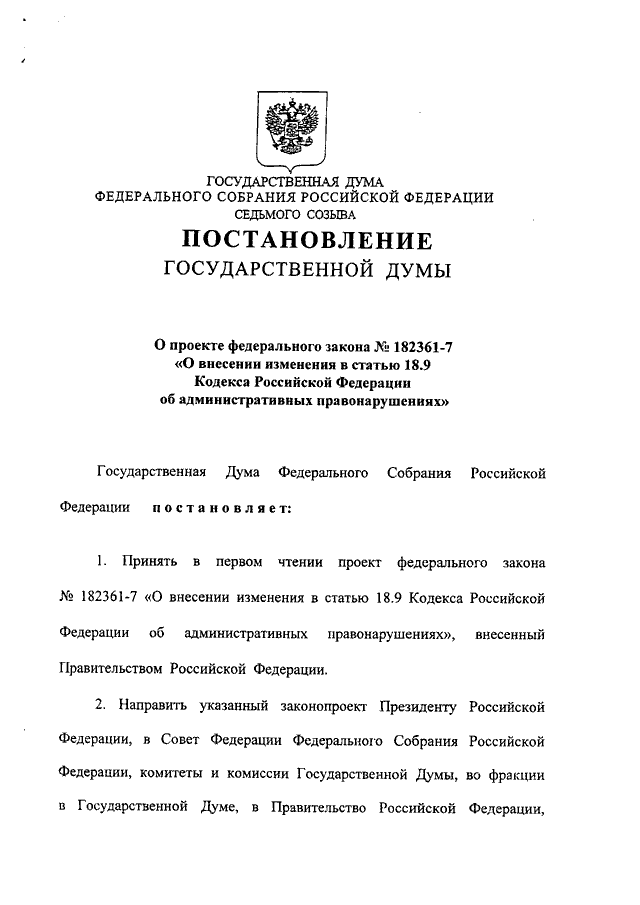 "О ПРОЕКТЕ ФЕДЕРАЛЬНОГО ЗАКОНА N 182361-7 "О ВНЕСЕНИИ ИЗМЕНЕНИЯ В СТАТЬЮ 18.9 КОДЕКСА РОССИЙСКОЙ ФЕДЕРАЦИИ ОБ АДМИНИСТРАТИВНЫХ ПРАВОНАРУШЕНИЯХ"